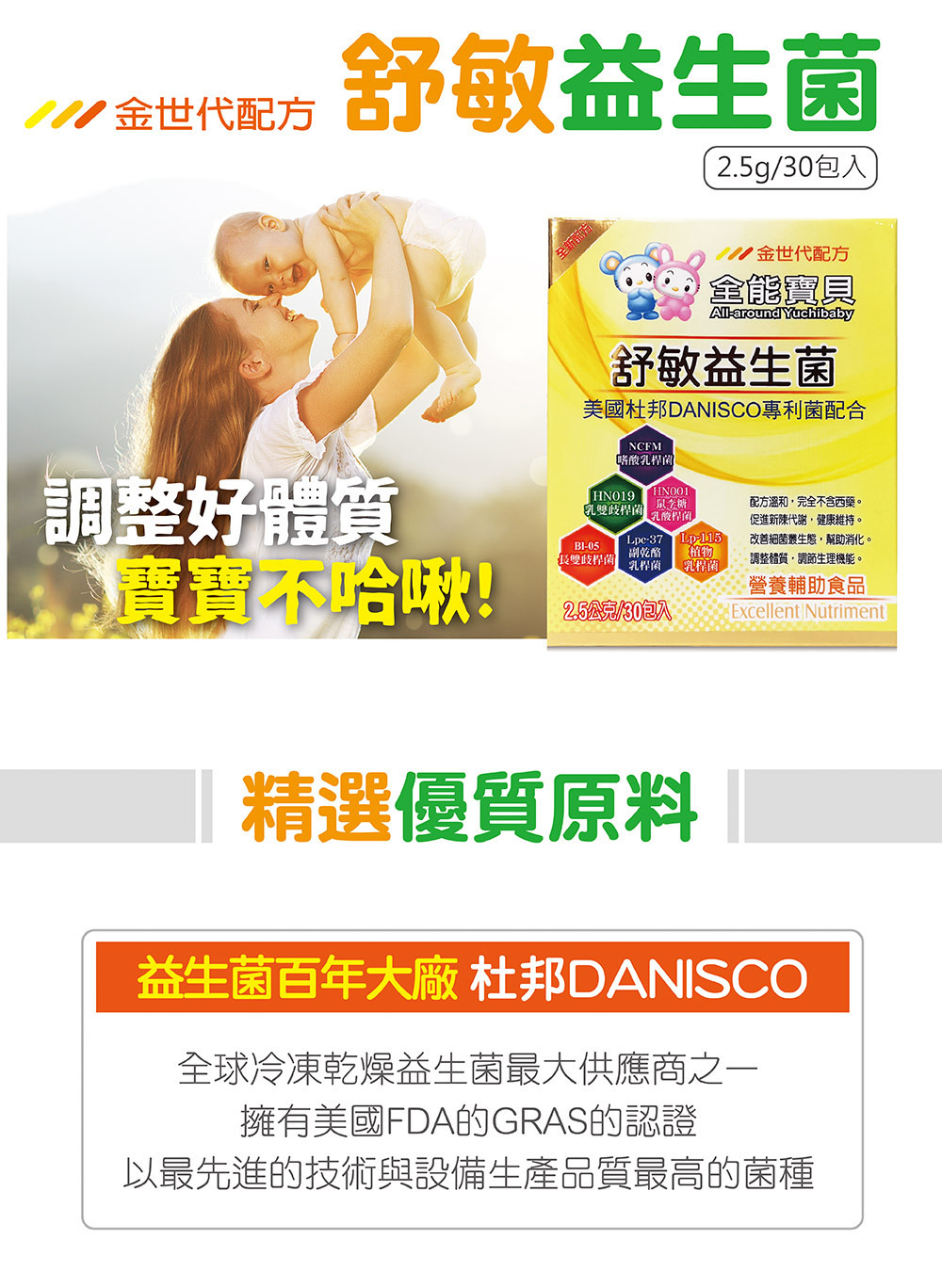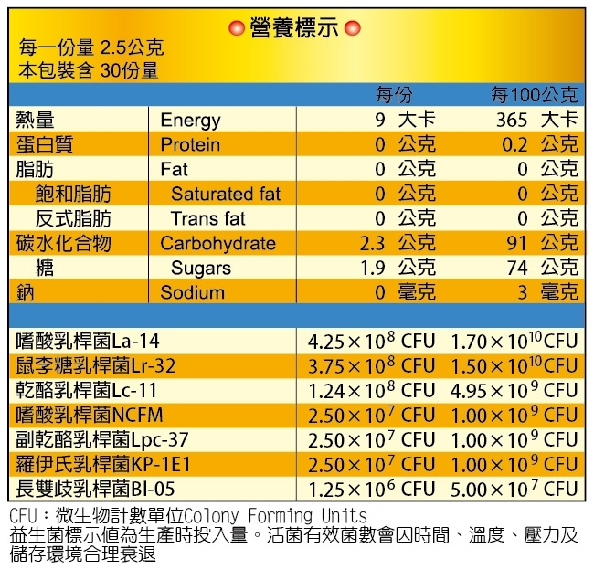 成份原料:乳糖、葡萄糖、玉米澱粉(非基因改造)、麥芽糊精(非基因改造)、磷酸鈣、菊糖、海藻糖、複合益生菌(嗜酸乳桿菌La-14、鼠李糖乳桿菌Lr-32、乾酪乳桿菌Lc-11、嗜酸乳桿菌NCFM、副乾酪乳桿菌Lpc-37、羅伊氏乳桿菌KP-1E1、長雙歧乳桿菌Bl-05、麥芽糊精)、檸檬酸
