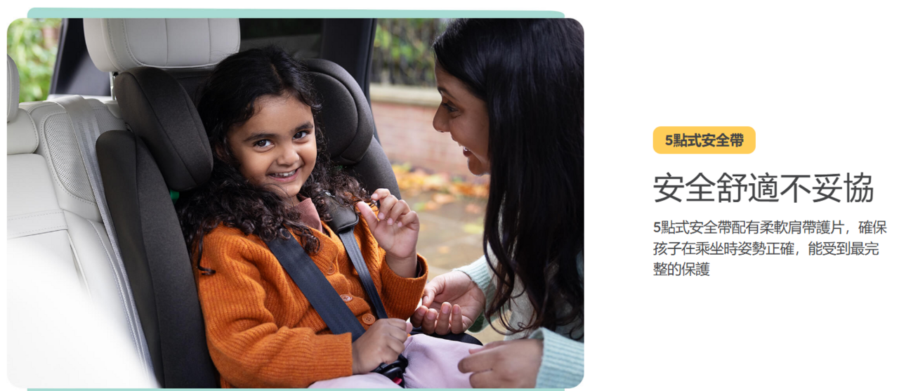 • 5點式安全帶一鍵調,提供完整保護