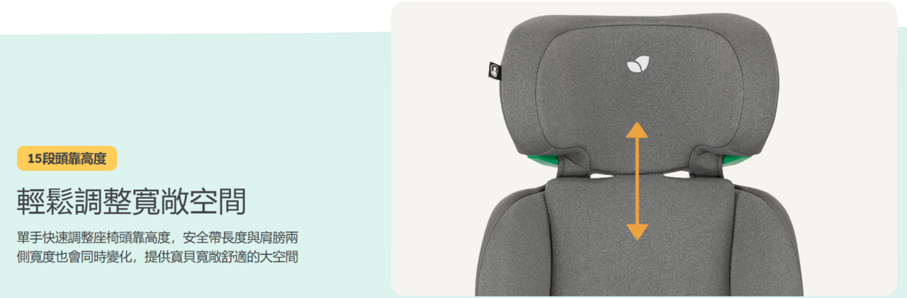 • 兒童模式(上拉帶+選用ISOFIX,使用車用三點式安全帶):15-36公斤(3.5-12歲/100-150公分)