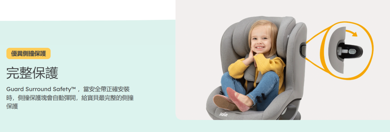 • 獨家Tri-Protect™ 三層頭靠保護,使用專利Intelli-Fit™ 記憶泡棉與高級吸震EPP,立體包覆的側撞防護,保護新生兒頭部安全