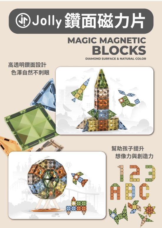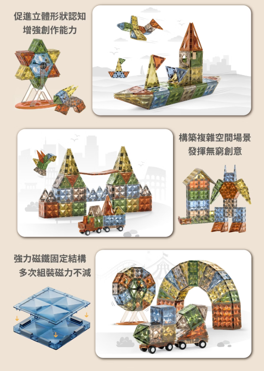 強大磁力,隨心建構: 內建強力磁鐵,邊緣對應精準,無論是平面拼貼還是高難度立體造型(如摩天輪、飛機),都能穩固成型,不易倒塌。