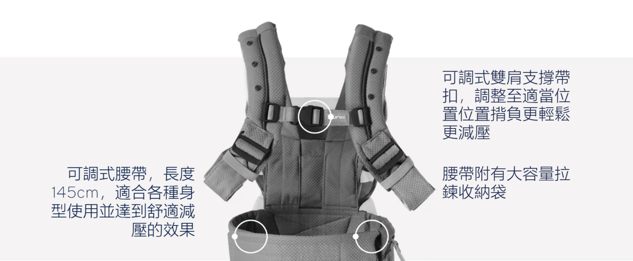 透氣網布設計,以及可調式軟墊肩帶、加寬腰帶,讓您可依照需求調整,揹負更輕鬆減壓。CUDL 4種模式均可維持寶寶符合人體工學的姿勢,保護脊椎、髖關節發育。內含新生兒增高墊設計,無需添加配件,從新生兒即可使用;拉鍊式調整,當寶寶長大只需解開拉鍊,即可轉換使用模式。
