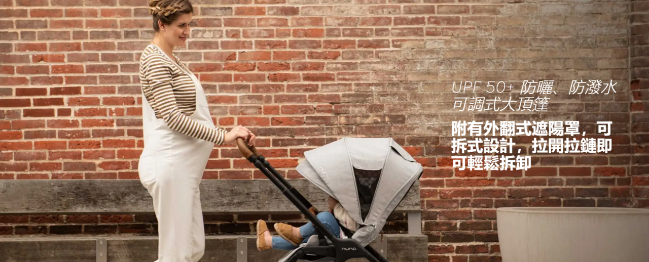 • UPF 50+ 防曬、防潑水可調式大頂篷,附有外翻式遮陽罩,可拆式設計,拉開拉鏈即可輕鬆拆卸
