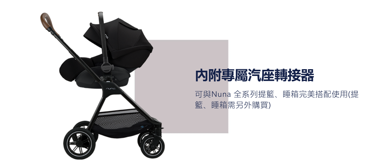 • 內附專屬汽座轉接器,可與Nuna 全系列提籃、睡箱完美搭配使用