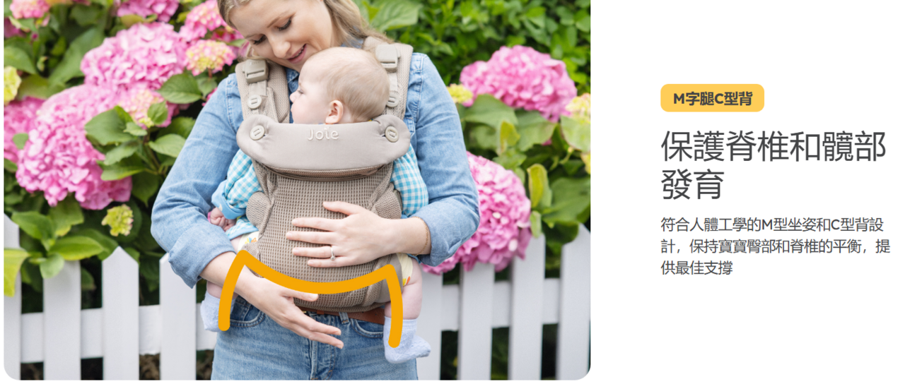 • 符合人體工學的M字腿坐姿和C型背設計,保持寶寶臀部和脊椎的平衡,提供最佳支撐