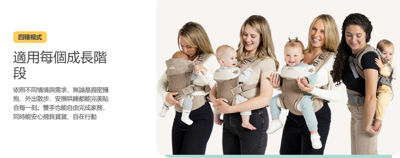 為您的寶寶提供不同的背攜姿勢。無論寶貝的心情或需要的視野如何,都能透過以下選擇獲得最佳支撐: