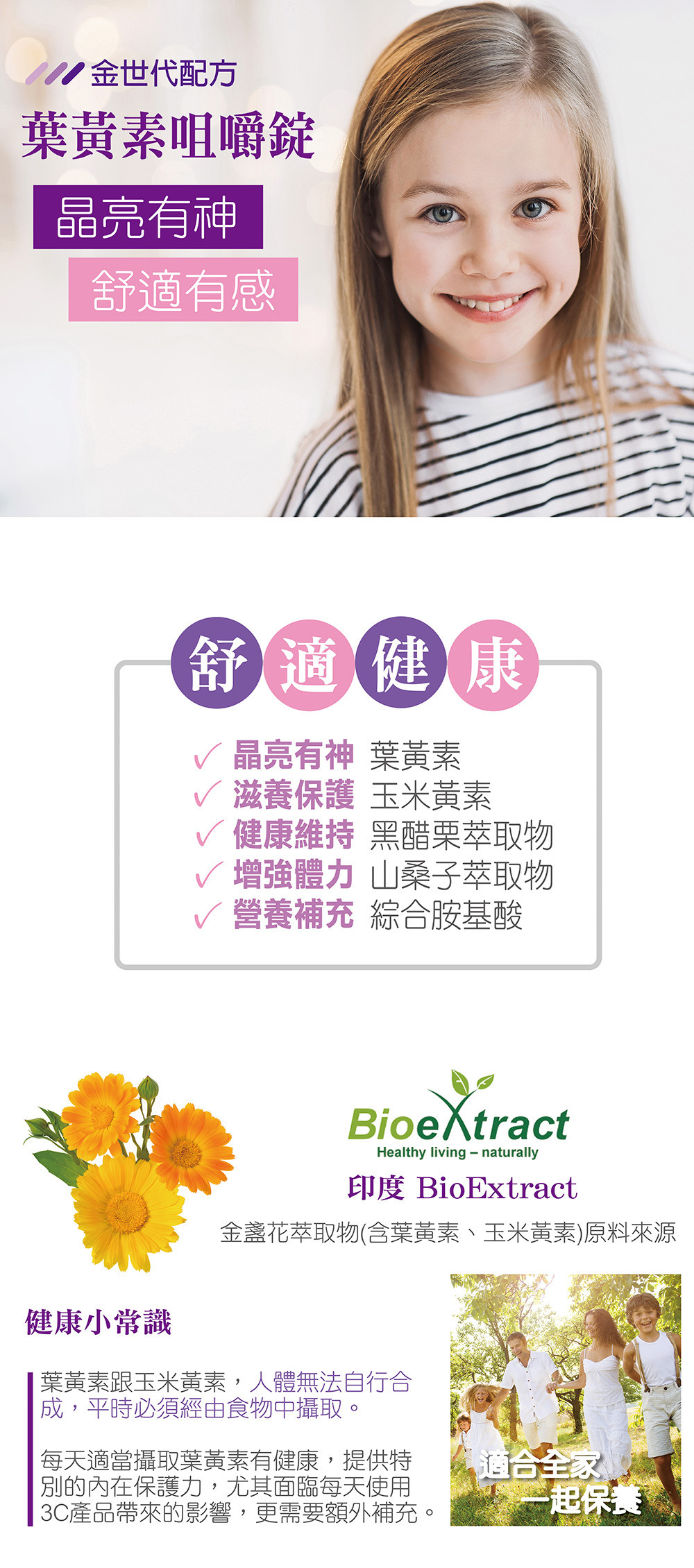 成分:山梨醇(甜味劑)、乳糖、葡萄糖、蔓越莓果汁粉(砂糖、阿拉伯膠、檸檬酸、麥芽糊精、蔓越莓濃縮汁、洛神花萃取粉、DL-蘋果酸、檸檬酸鈉、香料)、維生素C、檸檬酸、莓果香料、綜合胺基酸(麥芽糊精、L-麩酸、L-天冬胺酸、L-脯胺酸、L-白胺酸、胺基乙酸、L-α-胺基異戊酸、鹽酸L-二胺基己酸、L-異白胺酸、L-羥丁胺酸、L-精胺酸、L-組胺酸、L-苯丙胺酸、DL-蛋胺酸、L-酪胺酸、L-色胺酸)、硬脂酸鎂、金盞花萃取粉(含游離型葉黃素、玉米黃素) [蔗糖、金盞花萃取物、辛烯基丁二酸鈉澱粉、聚山梨醇酐脂肪酸酯(乳化劑)]、檸檬酸鈉、天然梔子紅色素粉(麥芽糊精、梔子紅色素)、黑醋栗萃取粉(含花青素) (黑醋栗萃取物、麥芽糊精)、山桑子萃取粉(含花青素) (山桑子萃取物、麥芽糊精)、綠蜂膠粉(含異戊二烯類黃酮) (玉米澱粉、綠蜂膠萃取液、二氧化矽)、流行鏈球菌發酵物(含玻尿酸)、甜菊糖苷(甜味劑)