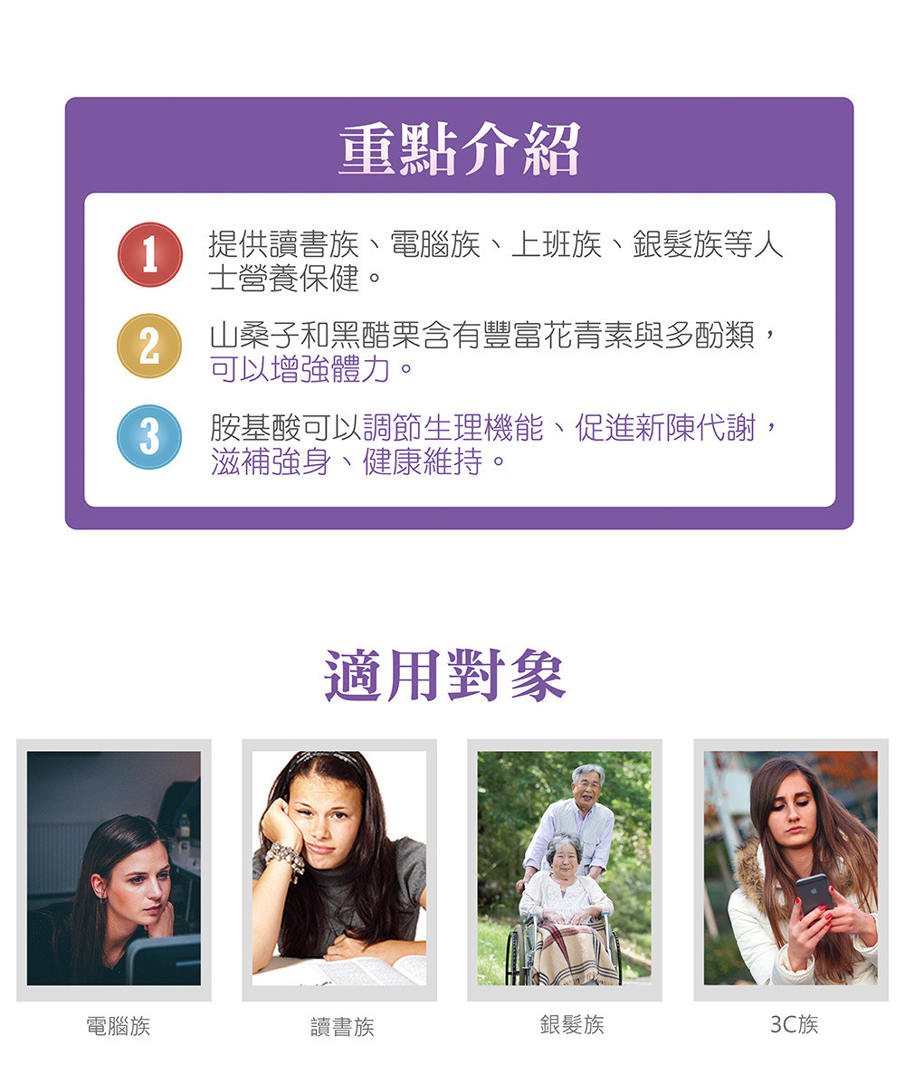 提供讀書族、電腦族、上班族、銀髮族等人士營養保健。
